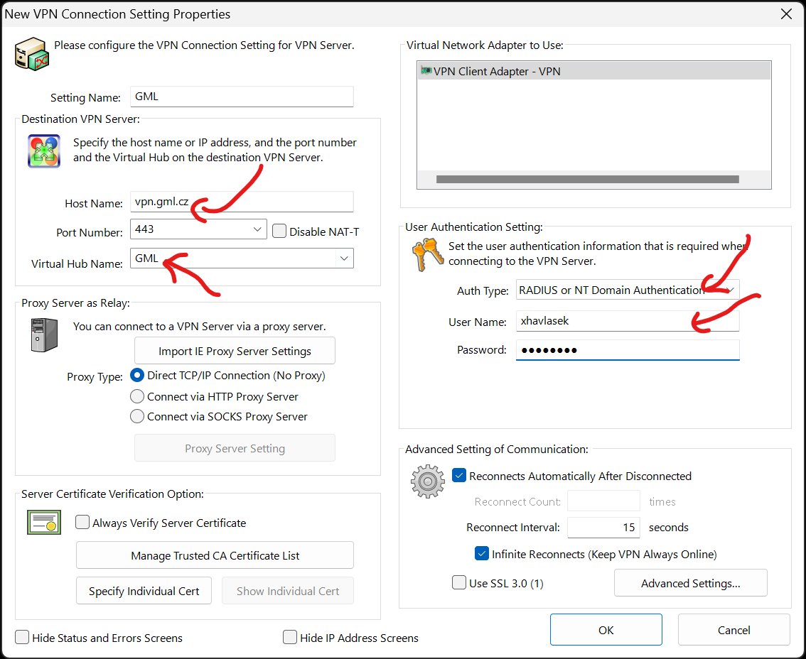 Nová VPNka (funkční od 10/2022) je s původní kompatibilní, stačí změnit konfiguační soubor .ovpn za softethervpn-gml-konfigurace-pro-openvpn.zip, balíček je zaheslován, heslo vám sdělí někdo z informatiků. Součástí souboru .ovpn je i klíč a certifikát, netřeba je ukládat zvlášť.