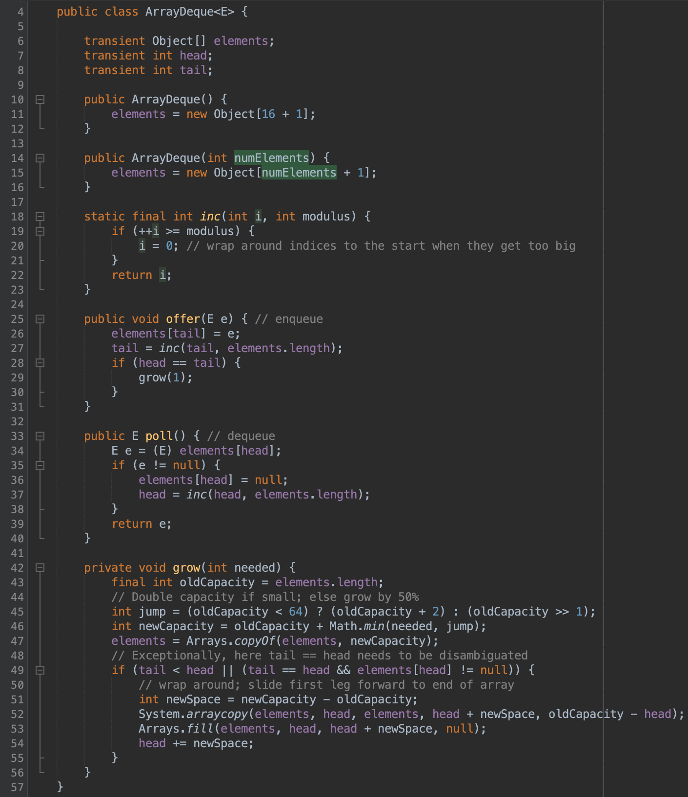 Implementací cyklického pole je například kolekce ArrayDeque v jazyce Java, tady je její zjednodušená verze