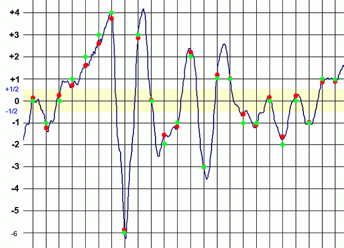 Zelené tečky jsou výsledné hodnoty získané během kvantování.