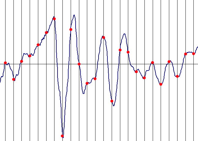 Červené tečky jsou jednotlivé vzorky, které byly pořízeny ve stejných intervalech.