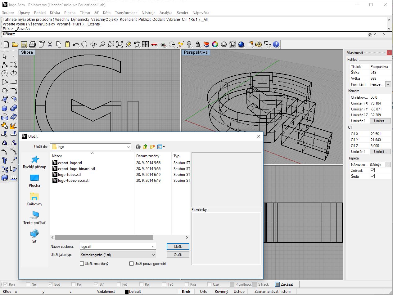 Druhou možností je nakreslit si vlastní model v nějakém 3D programu. Na GML učíme Blender, Rhinoceros a Fusion 360. Návod na Rhinoceros najdete v projektu PES, sada 26. Všechny 3D programy umějí ukládat do souboru typu .STL. Například: