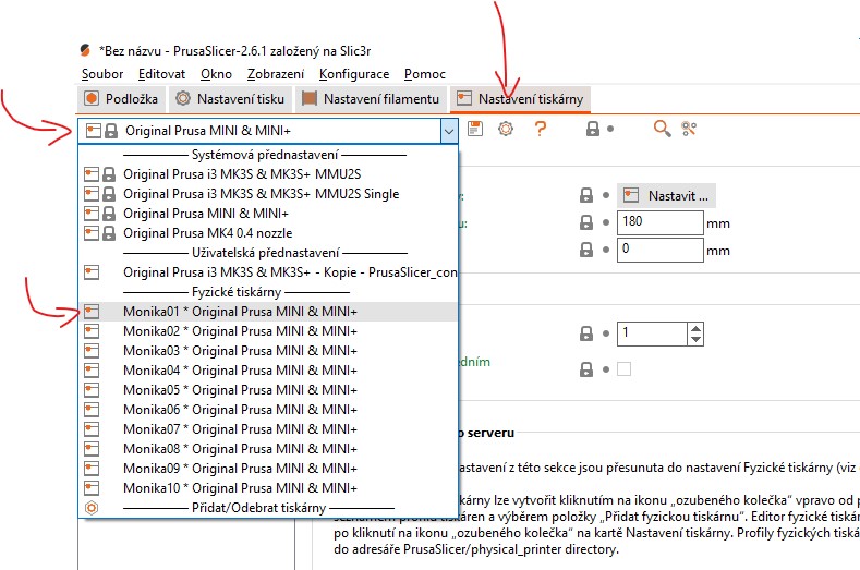 Po spuštění Prusa SLiceru nejprve zvolíme tiskárnu, pro kterou chceme model připravovat: