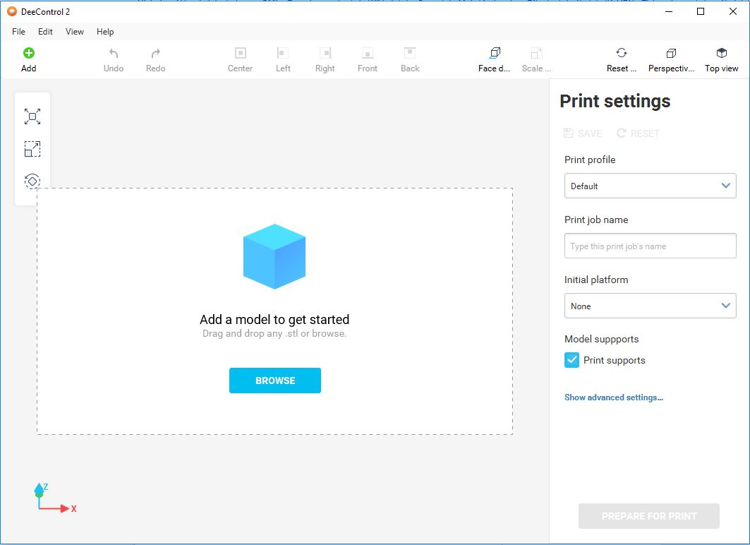 Po spuštení uživatel vidí výzvu k přidání modelu (souboru .STL):