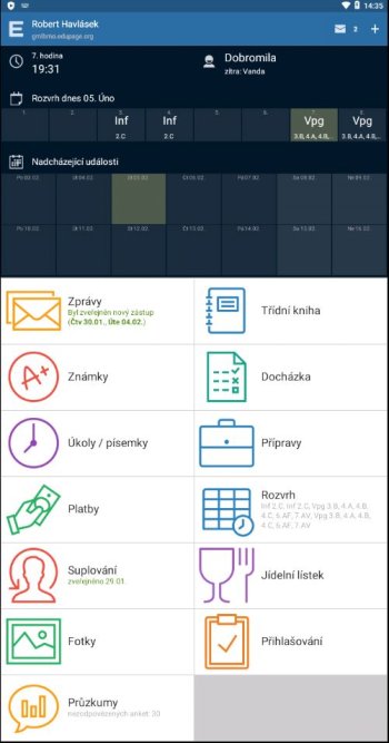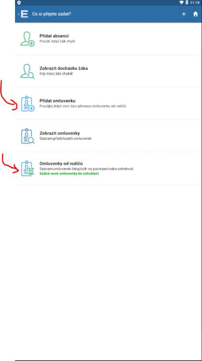 Omluvenku, kterou řeší třídní přímo se studenty v učebně, může zadat do systému pomocí mobilu (v aplikaci Edupage). V základní obrazovce: