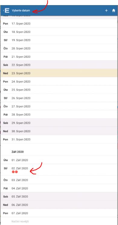 Listovat mezi jednotlivými týdny lze pomocí v horním menu vpravo. Pokud zalistujeme do předchozího školního roku, automaticky se sníží třída o ročník. Všimněte si tlačítka