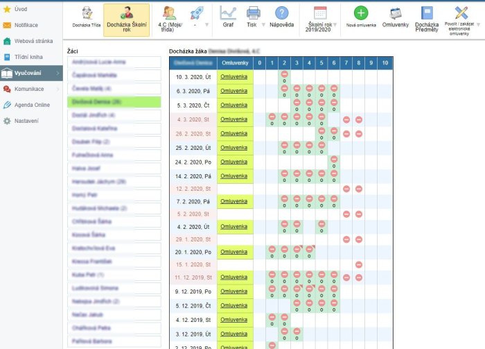 Závorka s číslem za jménem studenta, například , znamená počet jeho nevyřešených hodin. Rovněž růžový podklad pod konkrétním datem znamená nějaké jeho nevyřešené hodiny v tomto dni. Kliknutím na text Omluvenka lze zobrazit, upravit či smazat již existující omluvenku.