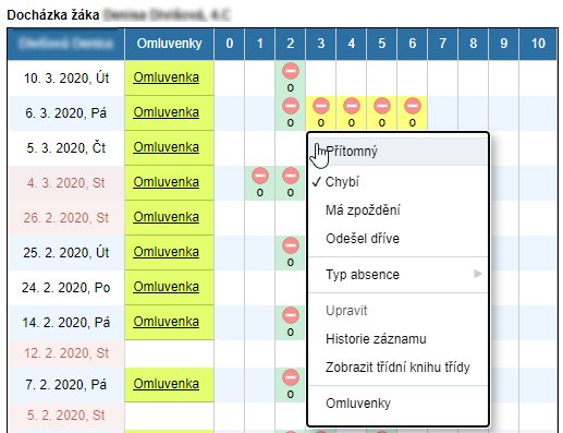- Chybí (lze dodatečně dopsat absenci studenta, když ji učitel nezapsal)