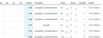 Kliknutím do řádku třídy zobrazíte velký rozpis všech studentů dané třídy, jejich jednotlivých známek: