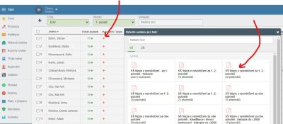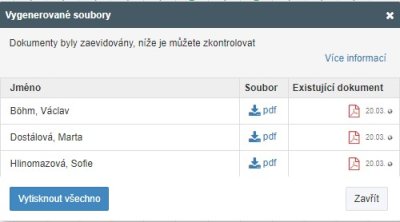 Pokud označíme vlevo checkboxem více studentů (případně rovnou checkboxem nahoře v záhlaví prvního sloupce všechny studenty), vyskočí černý pruh menu, v němž lze dialog generování vyvolat pro všechny označené: