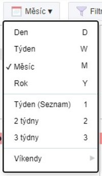 Přepínat lze též přímo klávesami: D (=den), W (=týden), M (=měsíc), 1 na nenumerické klávesnici (=řádkový rozpis jednotlivých dní), 2 na nenumerické klávesnici (=dva týdny), 3 tamtéž (=tři týdny).