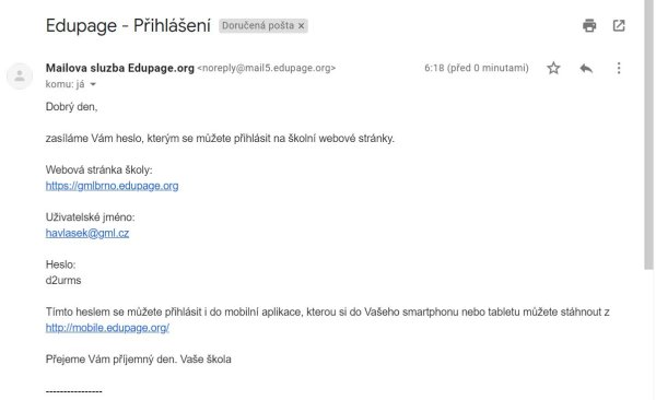 Systém Edupage má samostané účty (nespojené se školními loginy+hesly ani s loginy+hesly do pošty). Mailem od uživatele „Mailova sluzba Edupage.org“ Vám přijde první heslo:
