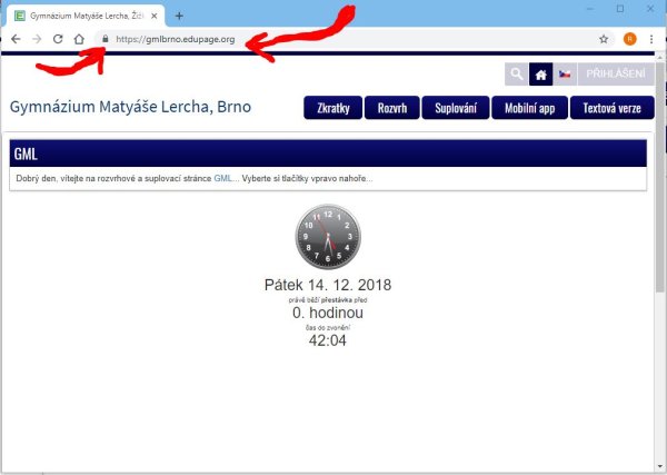 Není špatné si zkontrolovat, že adresa skutečně odpovídá https://gmlbrno.edupage.org a nalevo od ní je ikona uzamčeného zámku (viz červené šipky v obrázku) – pro ujištění, že nám ten web někdo nepodvrhnul…