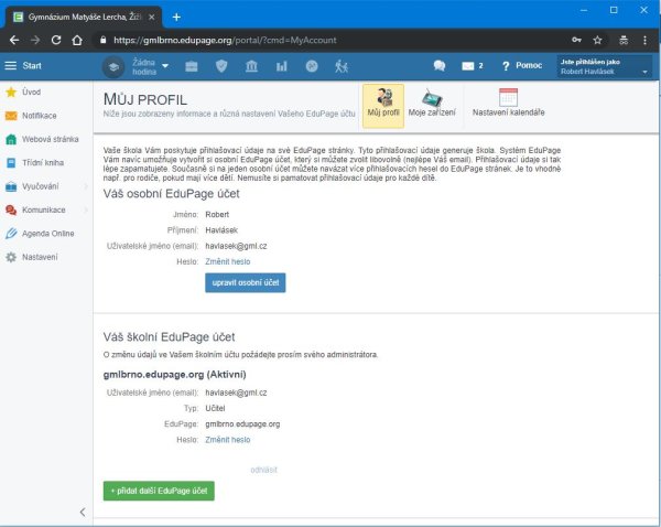 Napoprvé je velmi vhodné heslo změnit. Vpravo nahoře klikneme na tlačítko Jste přihlášeni jako (jméno+příjmení) a v něm na Můj profil. Objeví se stránka: