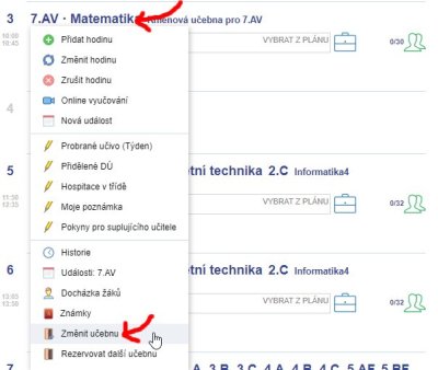Přihlásím se jako kantor do Edupage, zvolím Třídní knihu, dolistuji konkrétní den a hodinu v budoucnu, kdy se chci přestěhovat do jiné učebny. Na jméno svojí hodiny kliknu myší, objeví se podmenu: