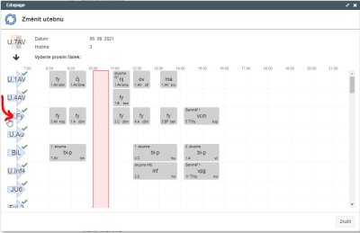 V dialogu si vyberu řádek kliknutím na jeho záhlaví (zkratku učebny) vlevo. Dialog se zavře a já v TK vidím, že jsem si učebnu změnil: