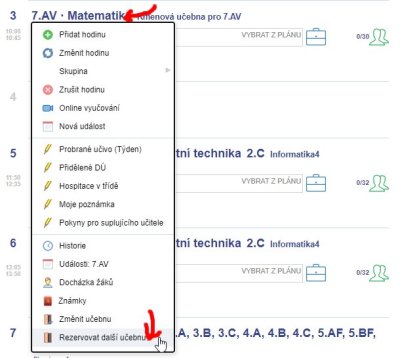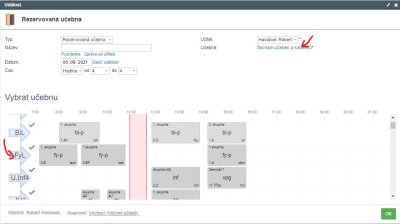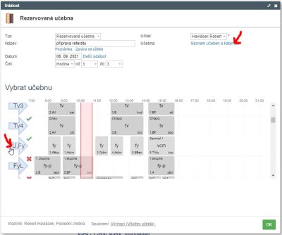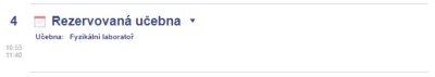 Pokud jsme učebnu úspěšně zarezervovali, objeví se v TK jako samostatná položka vedle naší hodiny: