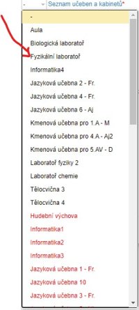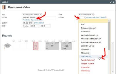 Můžete v něm zvolit Název (čistě ostatním uživatelům pro informaci), vpravo nahoře kliknete na pole Učebna a vyberete některou z černých (=nepoužitých) učeben. V seznamu učeben si povšimněte i úplně dole položky Více pro kolegy megalomany…