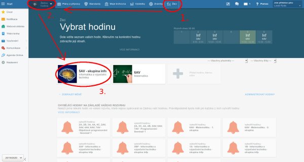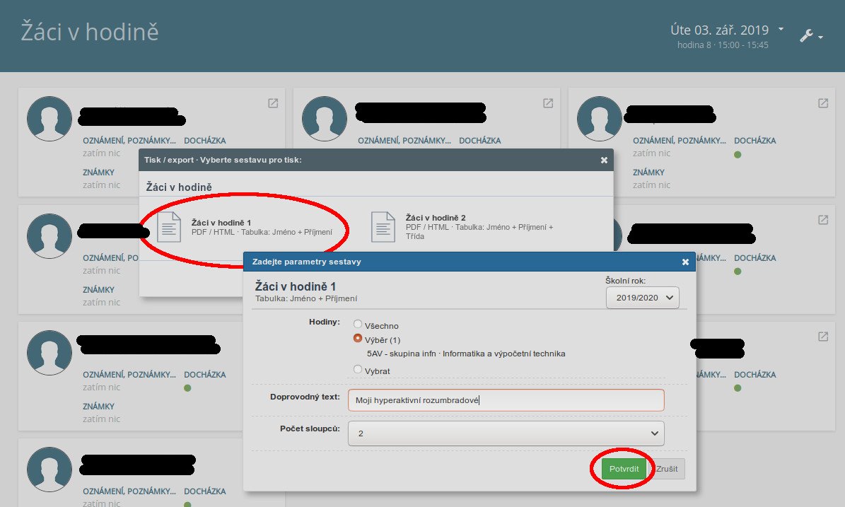 - V následujícím okénku zvolte „Žáci v hodině“, varianta 1 je jen příjmení a jméno, varianta 2 obsahuje i název třídy.