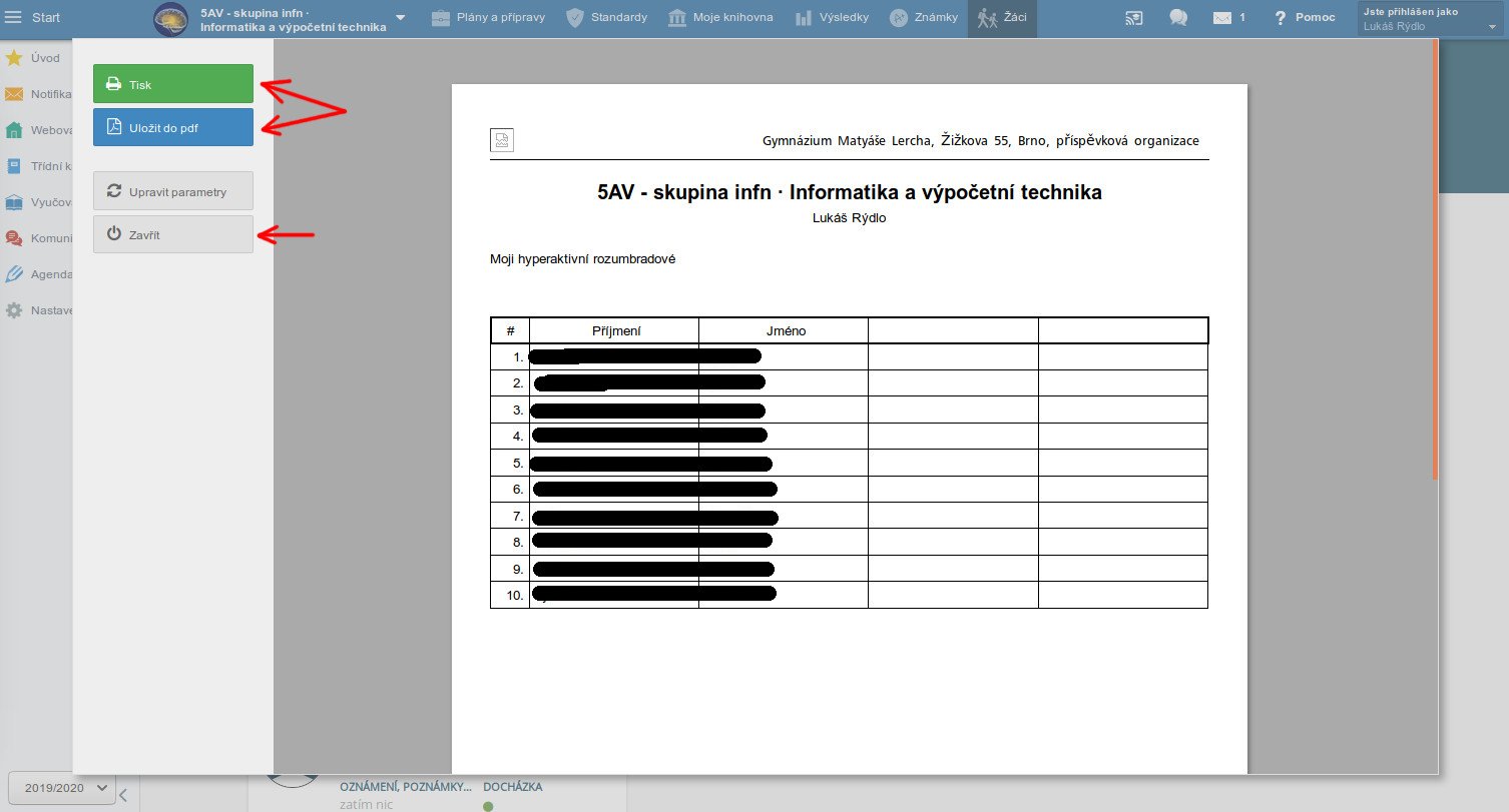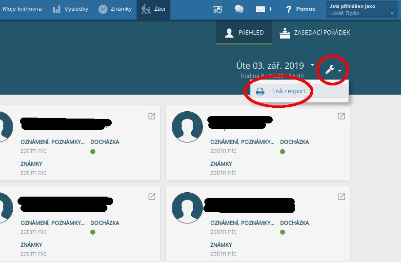Pro tisk nebo export seznamu žáků, které učím, do PDF (jiný formát zatím EduPage neumí).