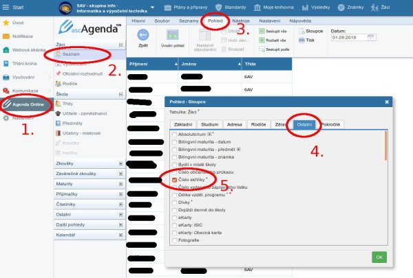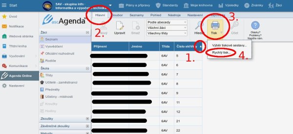 - Pokud chceme žáky řadit nějak jinak (třeba podle čísla skříňky), klikneme na záhlaví a pro potvrzení se objeví šipečka (na obrázku číslo 1). Při opakovaném kliknutí se řadí pozpátku.