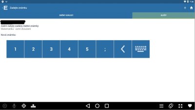 Tlačítky 1 až 5 lze zadat známku, tlačítko ; slouží jako oddělovník, kdybychom chtěli zadat víc známek jednomu studentovi zároveň. Tlačítko < je slouží k výmazu předchozího znaku (jako Backspace), tlačítko s piktogramem klávesnice dovolí zapsat známku textem (například 1- či 1.4, jejich hodnoty najdete v předchozí kapitole). Tlačítko Uložit vpravo nahoře nás vrátí do dialogu se známkami studenta, případně se lze zpětným tlačítkem (vlevo nahoře) vracet do seznamu studentů dané třídy, poté do seznamu tříd a poté do úvodní stránky aplikace.