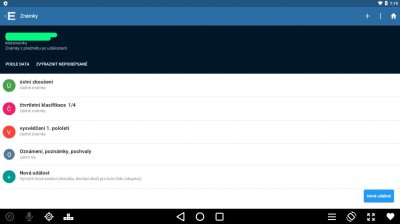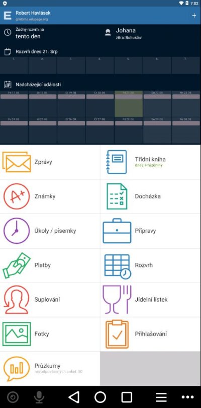 Spustíme aplikace Edupage na svém mobilu (pokud ji nemáme, viz nejprve Aplikace pro mobil: instalace, přístup ke svým osobním informacím). Na vysoko vidíme: