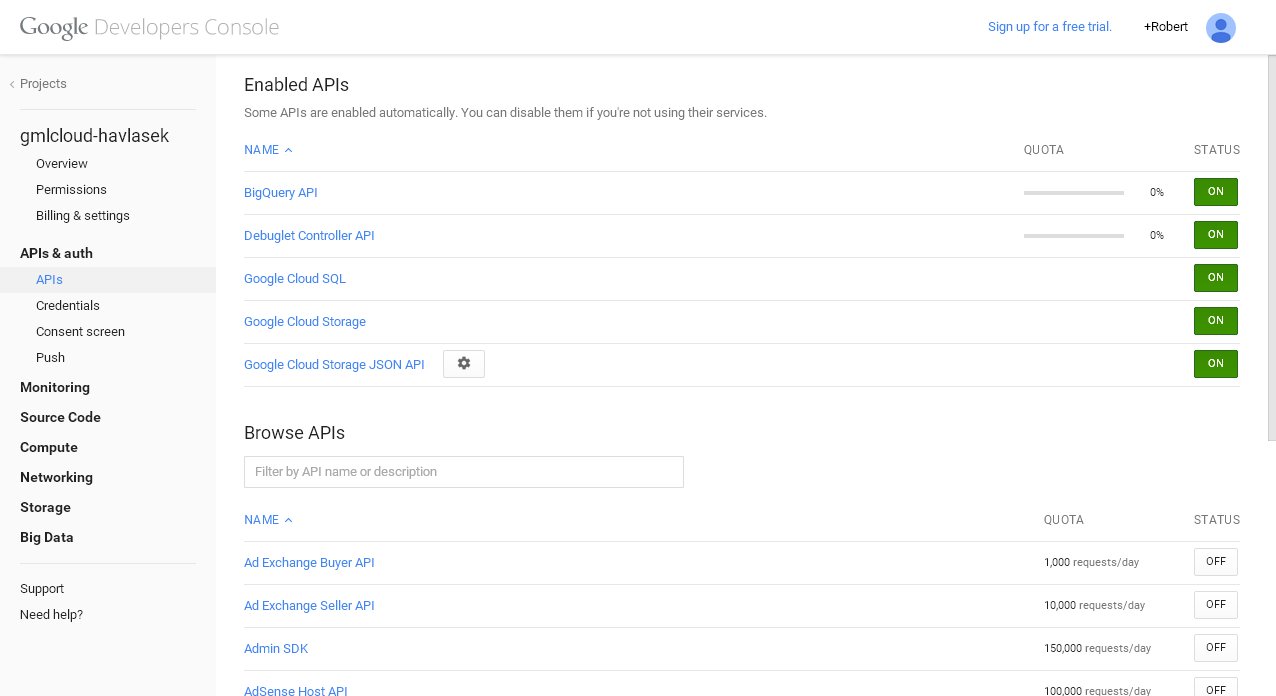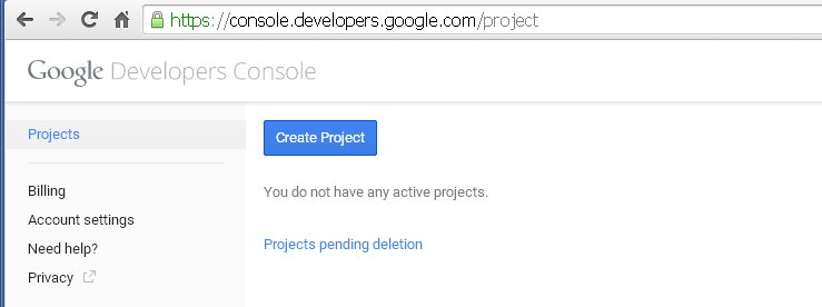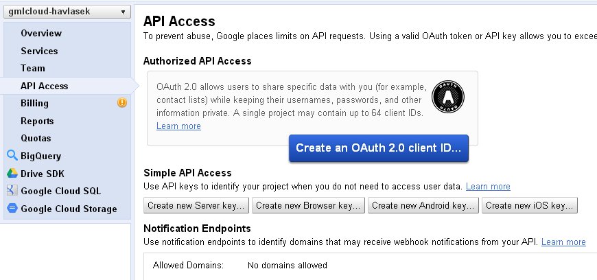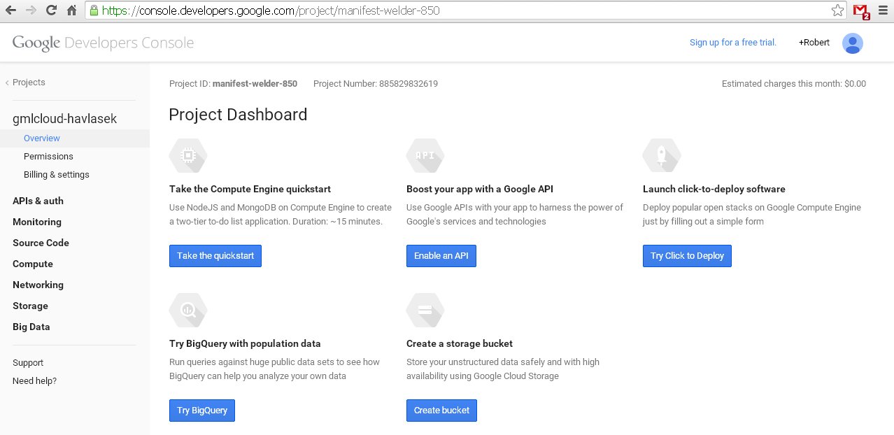 - V internetovém prohlížeči otevřete stránku https://console.developers.google.com/project, přihlašte se svým účtem u GoogleApps (tím, kterým čtete poštu, login typu havlasek@gml.cz, příslušné heslo). Uvitíte: