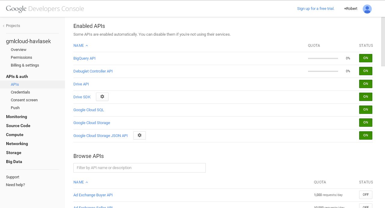 - V druhé části („Browse APIs“) musíme nastavit z Off na On položky „Drive API“ a „Drive SDK“. Ty se poté objeví nahoře mezi povolenými: