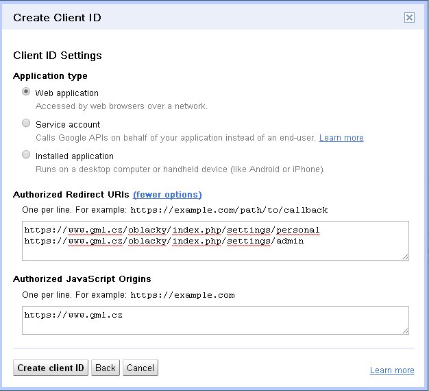 - Klikneme na Next, „Application type“ ponecháme button „Web application“, u nápisu Authorized Redirect URIs klikneme na „More options“ a do prvního pole vyplníme přesně dva řádky: http://www.gml.cz/oblacky/index.php/settings/personal a http://www.gml.cz/oblacky/index.php/settings/admin Spodní pole ponecháme tak, jak samo vzniklo. Situace bude vypadat takto: