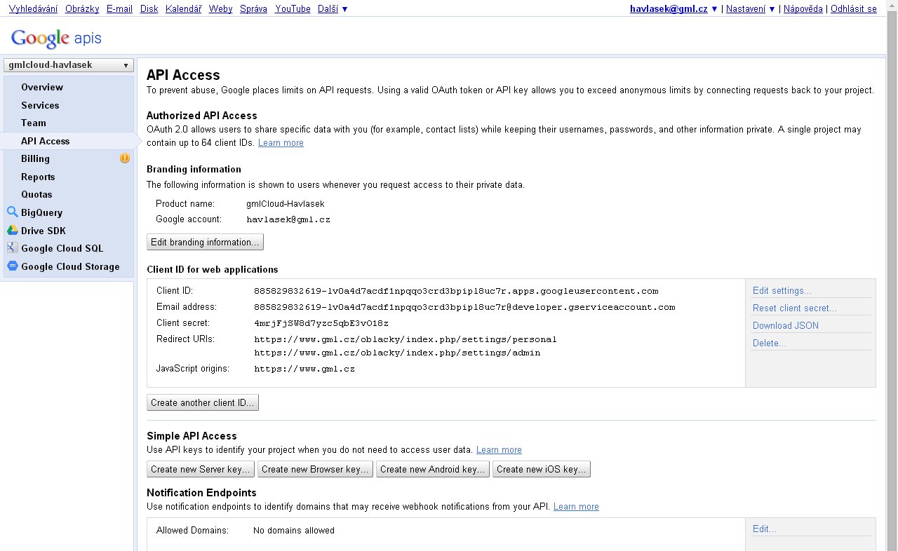 - Klikneme na tlačítko „Create client ID“, vyrobí se konečně přístupové údaje. Vidíme: