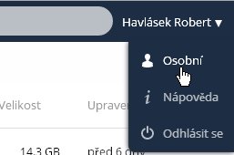 - Potřebovat budeme „Client ID“ a „Client secret“, které vyplníme do gmlCloudu. Buď si je někam zkopírujeme (např. do Poznámkového bloku) nebo necháme toto okno tak, jak je, a otevřeme další panel prohlížeče (např. stiskem CTRL+T). Přihlásíme se do http://www.gml.cz/oblacky (prosím, opravdu zde použijte /oblacky, ne /soubory, je nutné, aby adresa zněla stejně jako ta, pro niž máme přístup povolený). Vpravo nahoře u svého jména zvolíme stránku „Osobní“: