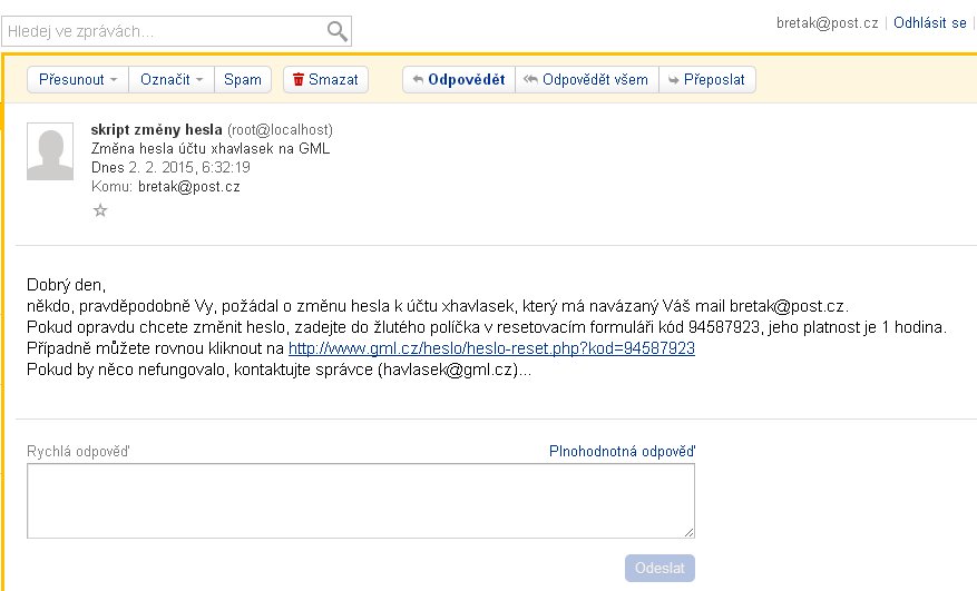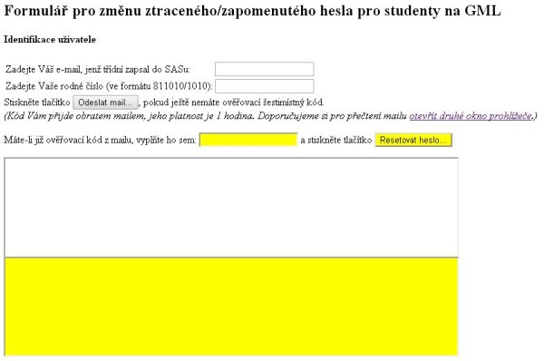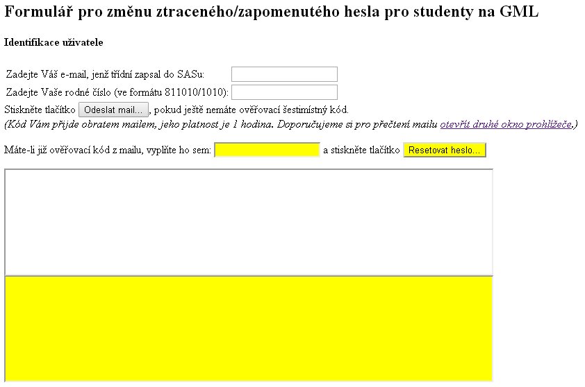 Ztratíte-li nebo si chcete změnit heslo pro svůj GML účet, jděte na adresu http://www.gml.cz/heslo. Adresa by měla fungovat z pevného počítače na GML, přes GML wifi i zvenku (např. z domu). Objeví se bíložlutá stránka: