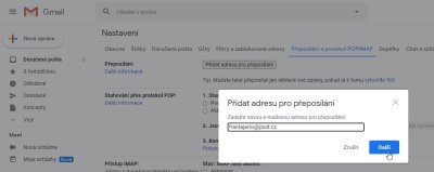 Vpravo nahoře kliknete na ozubené kolečko (ikona Nastavení) , pod ním na tlačítko Zobrazit všechna nastavení. V záložce Přeposílání a protokol POP/IMAP kliknete na tlačítko Přidat adresu pro přeposílání, v dialogu vyplníte soukromou adresu: