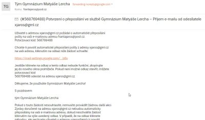 Ověřit (potvrdit, že skutečně chceme přeposílání) lze buď kliknutím na první z odkazů v textu a tlačítko Potvrdit nebo zkopírováním/opsáním potvrzovacího kódu zpět do školního GMailu. Kartu se soukromou poštou zavřeme.