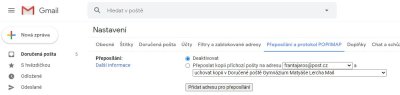 Nezbývá než kliknout na radiobutton Přeposlat kopii příchozí pošty na adresu, klidně uchovejte kopii v Doručené poště školního GMailu, chcete-li. (Má neomezenou kapacitu a kopie mailů zde ničemu nevadí.)