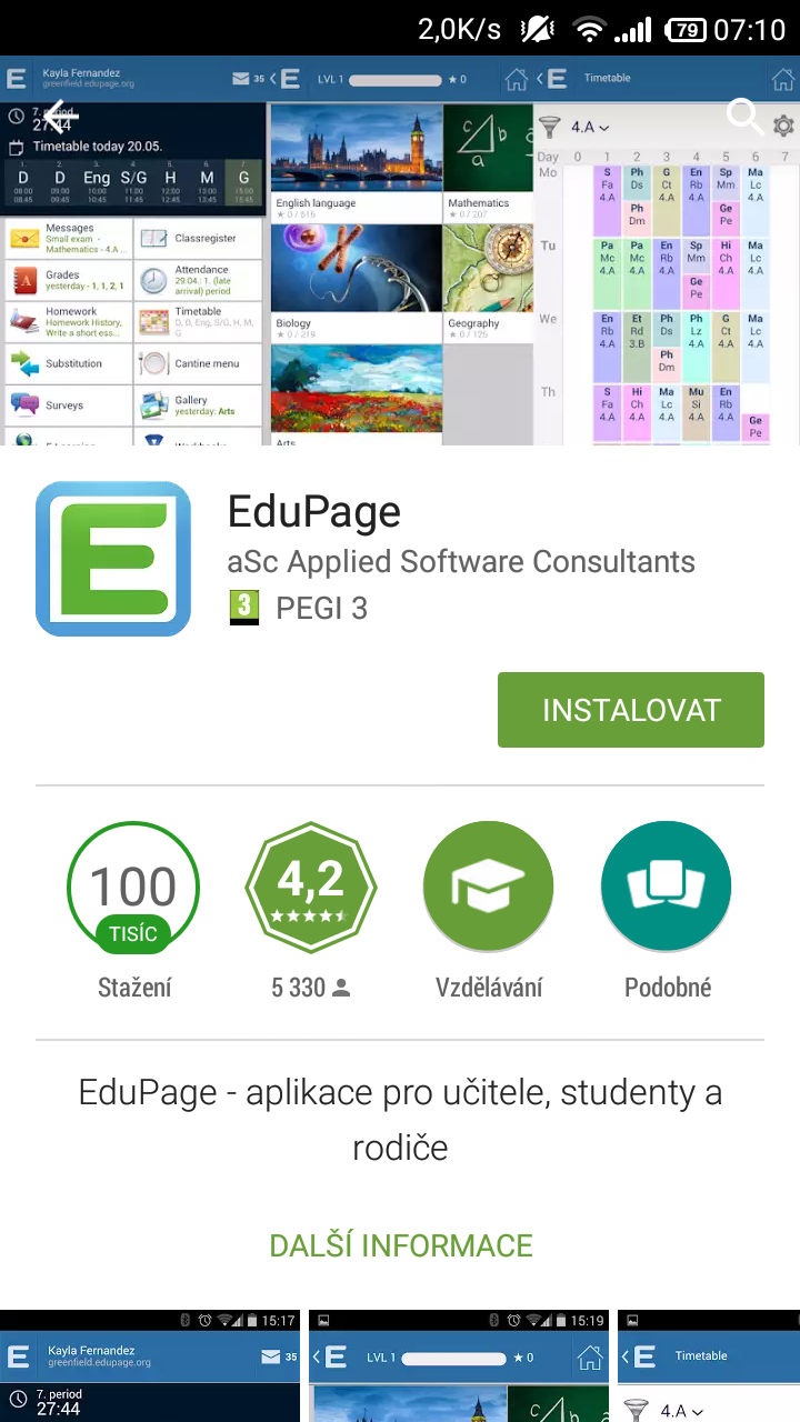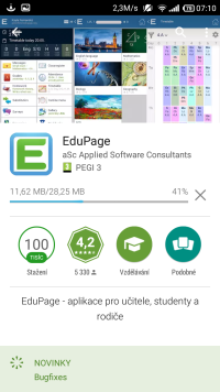 Na Androidu spustíme GooglePlay, do vyhledávání zadáme EduPage (přesný odkaz na aplikaci). Vidíme: