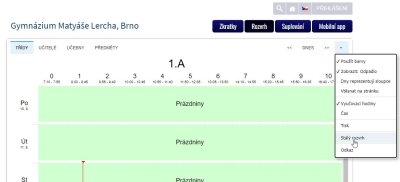 Odkaz na aktuální rozvrhy najdete na intranetu v části uprostřed nebo přímo na Rozvrh v Edupage. Pomocí dvojšipek « a » lze listovat týdny, v nichž je už aplikováno i suplování. Pomocí šipky dolů lze zvolit Stálý rozvrh, který je celoroční (bez suplování):